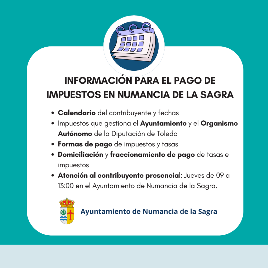 Numancia de la Sagra-: Los vecinos de Numancia de la Sagra deben cumplir con diversas obligaciones tributarias tanto a nivel municipal como provincial. A continuación, se detallan los principales impuestos, el calendario del contribuyente, las formas de pago disponibles y las opciones para fraccionar los pagos.