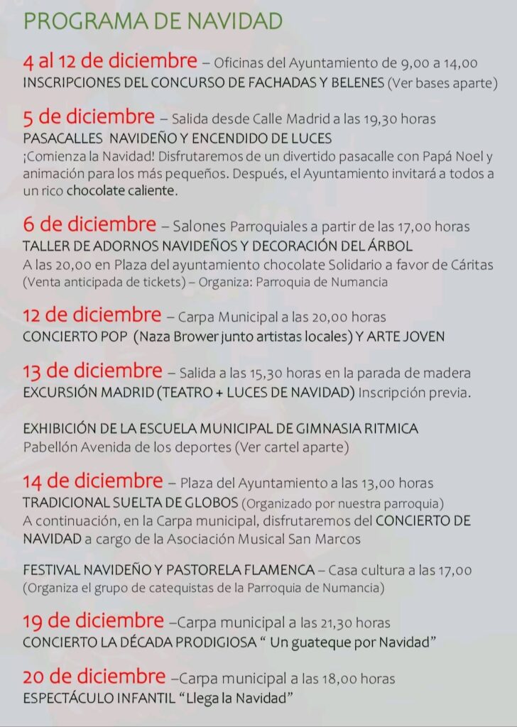 Ya está disponible el Programa de Navidad 2025/26 de Numancia de la Sagra, una completa agenda de actividades diseñada para que nuestros vecinos disfruten de unas fiestas repletas de tradición, música, cultura y entretenimiento para todas las edades.