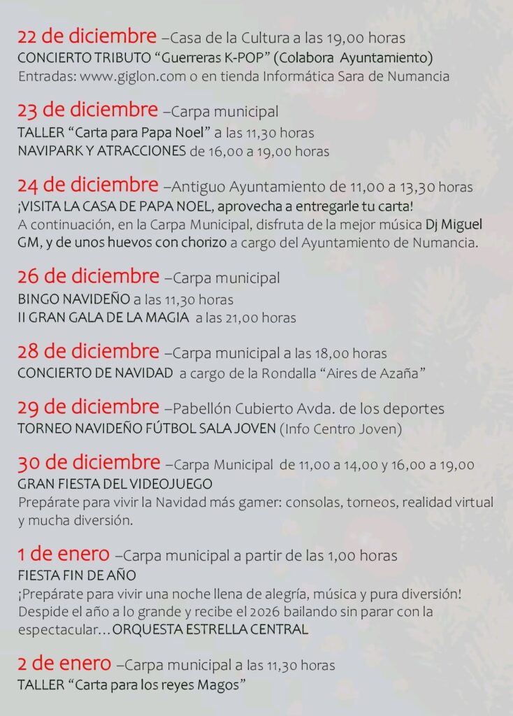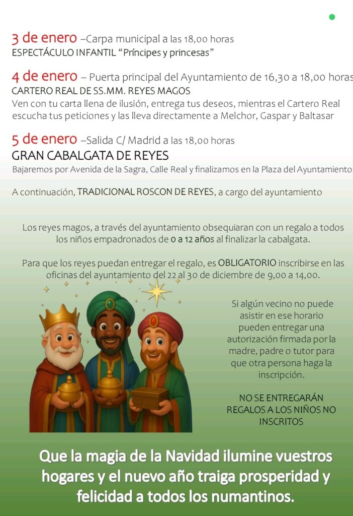 El Ayuntamiento ha destacado que este amplio y variado programa busca “llenar de magia, convivencia y alegría cada rincón del municipio”, deseando que “la luz de la Navidad ilumine los hogares y el nuevo año traiga prosperidad y felicidad a todos los numantinos”.